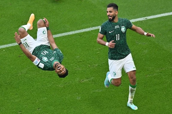 Saudi Arabia's midfielder #10 Salem Al-Dawsari celebrates after scoring his team's second goal during the Qatar 2022 World Cup Group C football match between Argentina and Saudi Arabia at the Lusail Stadium in Lusail, north of Doha on November 22, 2022. (Photo by Glyn KIRK / AFP)
