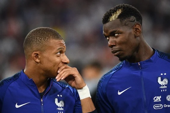 France's midfielder Kylian Mbappe (L) and France's midfielder Paul Pogba talk during the national anthem before the UEFA Nations League football match Germany against France on September 6, 2018 at the Allianz Arena in Munich, southern Germany. (Photo by FRANCK FIFE / AFP)
