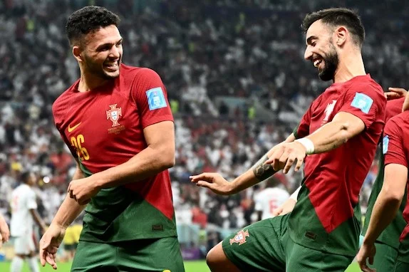 Portugal's midfielder #08 Bruno Fernandes jokes with forward #26 Goncalo Ramos as Portugal's defender #05 Raphael Guerreiro (out of frame) celebrates after scoring his team's fourth goal during the Qatar 2022 World Cup round of 16 football match between Portugal and Switzerland at Lusail Stadium in Lusail, north of Doha on December 6, 2022. (Photo by Jewel SAMAD / AFP)
