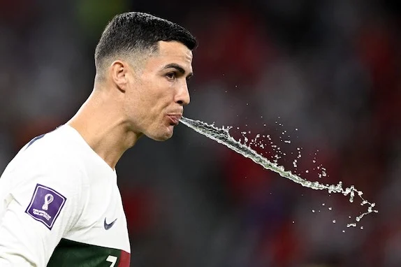 Portugal's forward #07 Cristiano Ronaldo spits water before the start of the Qatar 2022 World Cup Group H football match between South Korea and Portugal at the Education City Stadium in Al-Rayyan, west of Doha on December 2, 2022. (Photo by PATRICIA DE MELO MOREIRA / AFP)