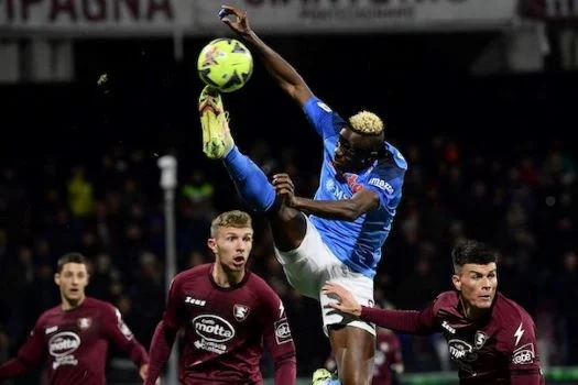 Napoli's Nigerian forward Victor Osimhen (Top) goes for a kick during the Italian Serie A football match between Salernitana and Napoli on January 21, 2023 at the Arigis stadium in Salerno. Filippo MONTEFORTE / AFP