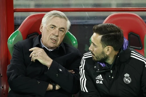 Real Madrid's Italian coach Carlo Ancelotti (L) speaks with his assistant during the FIFA Club World Cup final football match between Spain's Real Madrid and Saudi Arabia's Al-Hilal at the Prince Moulay Abdellah Stadium in Rabat on February 11, 2023. (Photo by Khaled DESOUKI / AFP)
