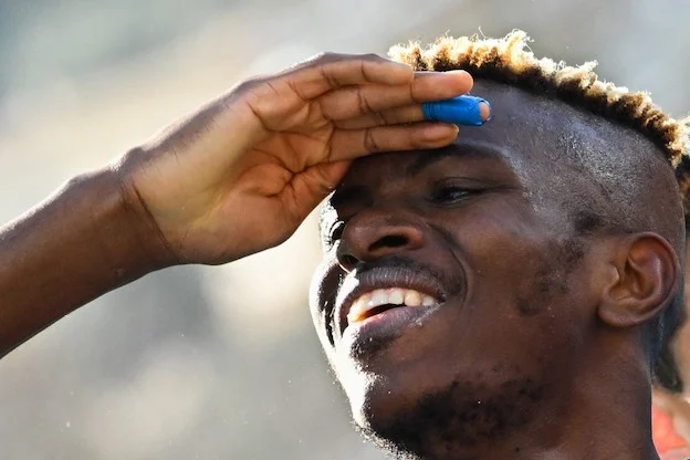 Napoli's Nigerian forward Victor Osimhen celebrates after scoring during the Italian Serie A football match between Spezia and Napoli on February 5, 2023 at the Alberto-Picco stadium in La Spezia. (Photo by Alberto PIZZOLI / AFP)