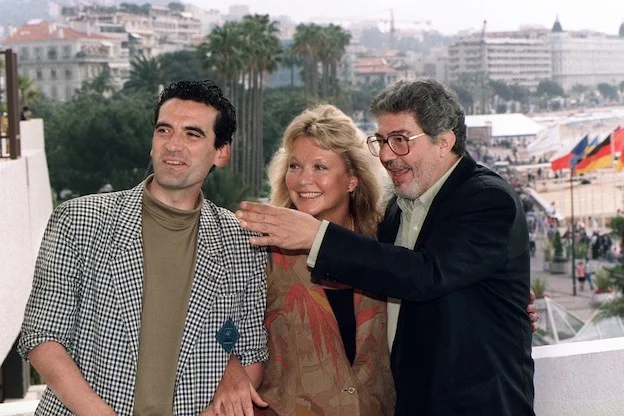 Italian Director Ettore Scola (R) jokes with French actress Marina Vlady (C) and Italian actor Massimo Troisi (L) during the 42th Cannes International Film Festival, where Scola presents his movie "Splendor", on May 14, 1989. AFP PHOTO AFP (Photo by AFP)