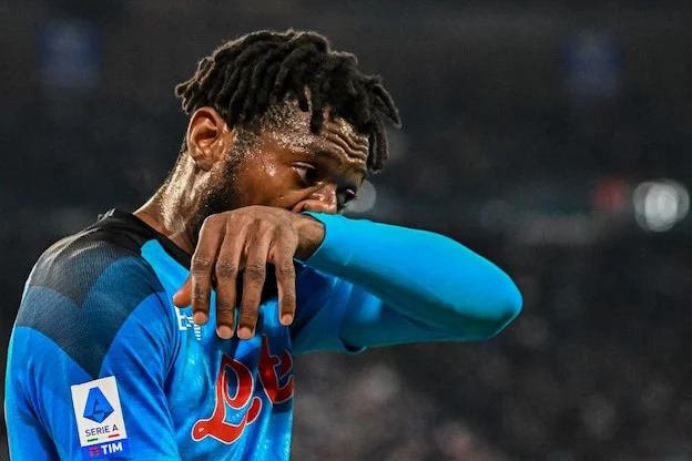 Napoli's Cameroonian midfielder Andre Zambo Anguissa reacts during the Italian Serie A football match between Napoli and Lazio on March 3, 2023 at the Diego-Maradona stadium in Naples. (Photo by Alberto PIZZOLI / AFP)