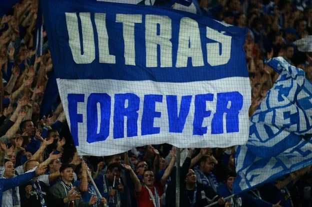 Schalke supporters wave a flag shows "Ultras forever" during the German first division Bundesliga football match Schalke 04 vs 1. FSV Mainz 05 in Gelsenkirchen, western Germany on September 25, 2012. AFP PHOTO / PATRIK STOLLARZ RESTRICTIONS / EMBARGO - DFL RULES TO LIMIT THE ONLINE USAGE DURING MATCH TIME TO 15 PICTURES PER MATCH. IMAGE SEQUENCES TO SIMULATE VIDEO IS NOT ALLOWED AT ANY TIME. FOR FURTHER QUERIES PLEASE CONTACT DFL DIRECTLY AT + 49 69 650050. (Photo by PATRIK STOLLARZ / AFP)
