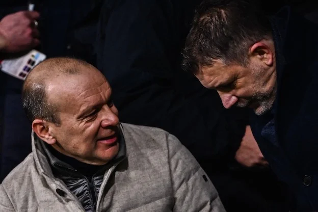 Juventus' new CEO Maurizio Scanavino (L) attends the Italian Serie A footbal match between Cremonese and Juventus on January 4, 2023 at the Giovanni-Zini stadium in Cremona. (Photo by Marco BERTORELLO / AFP)