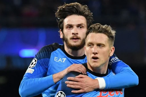 Napoli's Polish midfielder Piotr Zielinski (R) celebrates with Napoli's Georgian forward Khvicha Kvaratskhelia after scoring a penalty and his side's third goal during the UEFA Champions League round of 16, second leg football match between SSC Napoli and Eintracht Frankfurt at the Diego-Maradona stadium in Naples on March 15, 2023. (Photo by Tiziana FABI / AFP)