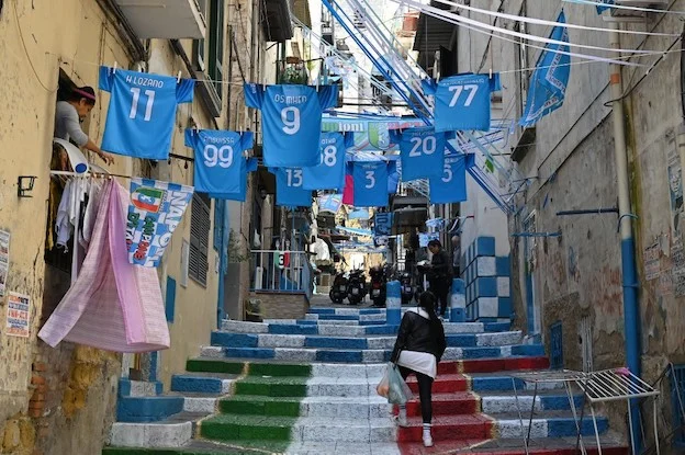 (FILES) In this file photo taken on March 24, 2023 Flags, banners, jerseys with the players' names and a painted stairway decorate the Quartieri Spagnoli district on March 24, 2023 in Naples, as the city braces up for its potential first Scudetto championship win in 33 years. - From narrow streets to balconies, the whole city of Naples is tinged with blue, the colour of its football club which is about to win the Scudetto for the first time since 1990, then with Diego Maradona, who is still revered as a saint today. (Photo by Alberto PIZZOLI / AFP)