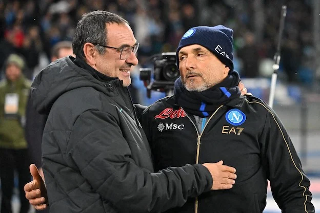 Lazio's Italian coach Maurizio Sarri (L) and Napoli's Italian coach Luciano Spalletti greet prior to the Italian Serie A football match between Napoli and Lazio on March 3, 2023 at the Diego-Maradona stadium in Naples. (Photo by Alberto PIZZOLI / AFP)