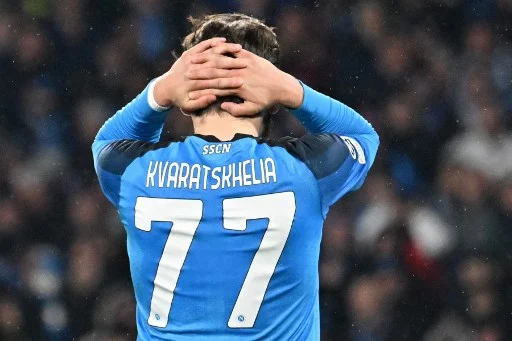 Napoli's Georgian forward Khvicha Kvaratskhelia reacts after missing a penalty during the UEFA Champions League quarter-finals second leg football match between SSC Napoli and AC Milan on April 18, 2023 at the Diego-Maradona stadium in Naples. (Photo by Alberto PIZZOLI / AFP)