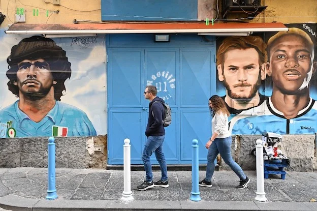 People walk past a mural depicting (From L) late Argentinian football legend Diego Maradona, current Napoli's Georgian forward Khvicha Kvaratskhelia, and current Napoli's Nigerian forward Victor Osimhen, in the Forcella district on March 24, 2023 in Naples, as the city braces up for its potential first Scudetto championship win in 33 years. - An incredible 19 points clear at the top of Serie A, it's surely only a matter of time until southern Italy's biggest club win the Scudetto for the first time since 1990, when Diego Maradona was still strutting his stuff in sight of Mount Vesuvius. (Photo by Alberto PIZZOLI / AFP)