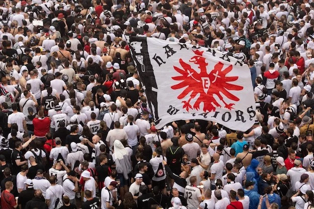 Eintracht Frankfurt fans gather at the Roemer Square in front of the town hall in the city centre of Frankfurt am Main, western Germany, on May 19, 2022, the day after German club Eintracht Frankfurt won the UEFA Europa League final against Rangers in Seville. (Photo by Yann Schreiber / AFP)