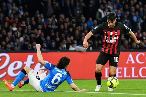 AC Milan's Spanish midfielder Brahim Diaz (R) dribbles Napoli's Portuguese defender Mario Rui prior to shoot to score his side's second goal during the Italian Serie A football match between SSC Napoli and AC Milan on April 2, 2023 at the Diego-Maradona stadium in Naples. (Photo by Tiziana FABI / AFP)