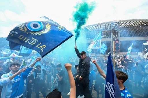 Napoli supporters cheer with colorful smoke and team flags as they assemble outside the Diego-Maradona stadium in Naples, on April 30, 2023, prior to the Italian Serie A football match between Napoli and Salernitana. - Naples braces for its potential first Scudetto championship win in 33 years. With a 17 point lead at the top of Serie A, southern Italy's biggest club is anticipating its victory in the Scudetto for the first time since 1990. (Photo by Andreas SOLARO / AFP)