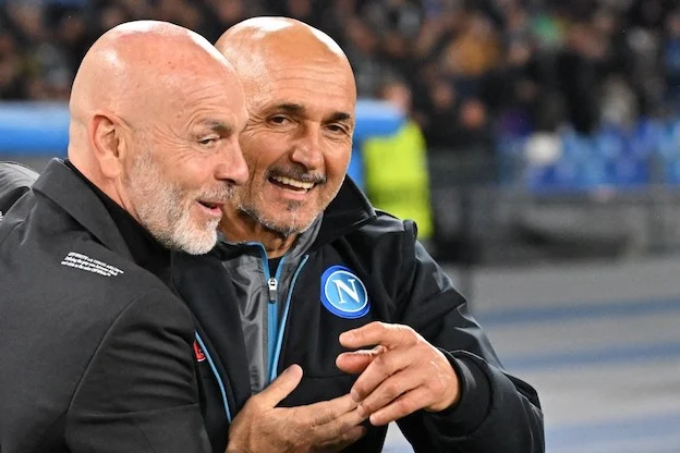 AC Milan's Italian coach Stefano Pioli (L) and Napoli's Italian coach Luciano Spalletti hug prior to the UEFA Champions League quarter-finals second leg football match between SSC Napoli and AC Milan on April 18, 2023 at the Diego-Maradona stadium in Naples. (Photo by Alberto PIZZOLI / AFP)