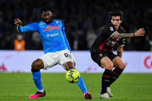 Napoli's Cameroonian midfielder Andre Zambo Anguissa (L) and AC Milan's Italian midfielder Sandro Tonali go for the ball during the Italian Serie A football match between SSC Napoli and AC Milan on April 2, 2023 at the Diego-Maradona stadium in Naples. (Photo by Tiziana FABI / AFP)