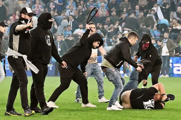 Udinese fans attack a Napoli fan (Bottom) as spectators invade the pitch at the end of the Italian Serie A football match between Udinese and Napoli on May 4, 2023 at the Friuli stadium in Udine. - Napoli ended a 33-year wait to win Italy's Serie A on May 4 after a 1-1 draw at Udinese secured their third league title and emulated the great teams led by Diego Maradona. (Photo by Tiziana FABI / AFP)