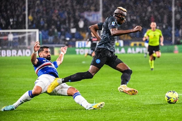 Sampdoria's Venezuelan defender Tomas Rincon (L) tackles Napoli's Nigerian forward Victor Osimhen before receiving a red card for this foul during the Italian Serie A football match between Sampdoria and Napoli on January 8, 2023 at the Luigi-Ferraris stadium in Genoa. (Photo by Andreas SOLARO / AFP)