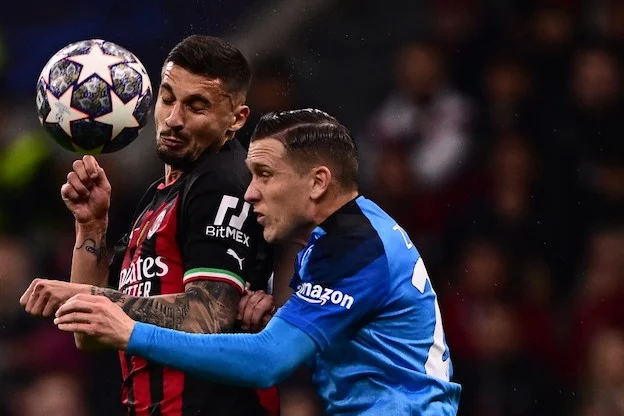 AC Milan's Bosnian midfielder Rade Krunic (L) and Napoli's Polish midfielder Piotr Zielinski go for a header during the UEFA Champions League quarter-finals first leg football match between AC Milan and SSC Napoli on April 12, 2023 at the San Siro stadium in Milan. (Photo by Marco BERTORELLO / AFP)