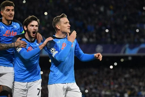 Napoli's Polish midfielder Piotr Zielinski (C) celebrates with Napoli's Italian defender Giovanni Di Lorenzo (L) and Napoli's Georgian forward Khvicha Kvaratskhelia after scoring a penalty and his side's third goal during the UEFA Champions League round of 16, second leg football match between SSC Napoli and Eintracht Frankfurt at the Diego-Maradona stadium in Naples on March 15, 2023. (Photo by Tiziana FABI / AFP)