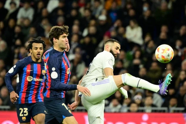 Barcelona's Spanish defender Marcos Alonso (L) fights for the ball with Real Madrid's French forward Karim Benzema during the Copa del Rey (King's Cup) semi final first leg football match between Real Madrid CF and FC Barcelona at the Santiago Bernabeu stadium in Madrid on March 2, 2023. (Photo by JAVIER SORIANO / AFP)