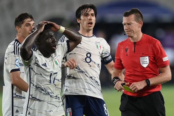 “un Europeo Under 21 che non prevede Var e Goal-Line Technology nel 2023, è una pagliacciata. E lascia sgomenti su quale strada l’Uefa intenda prendere (se ce ne è una) rispetto alla tecnologia applicata al calcio tanto sventolata come vessillo della trasparenza. L’Italia perde la gara d’esordio, ma senza voler cercare scusanti e al netto della gaffe di Udogie, mancano un clamoroso rigore non visto sull’1-1, un fallo solare non fischiato a Gouiri nell’azione che innesca il 2-1 della Francia. E un gol oltre la linea di porta francese segnato da Bellanova e che nessuno ha visto, né un arbitro fuori forma, né un guardalinee (il signor Honig) che forse aveva lasciato lì un parente, per giunta fuori posizione”.