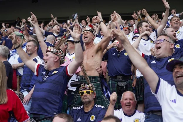 Supporters of Scotland cheer prior to the UEFA Euro 2024 group A qualification football match between Norway and Scotland in Oslo on June 17, 2023. (Photo by Heiko Junge / NTB / AFP) / Norway OUT