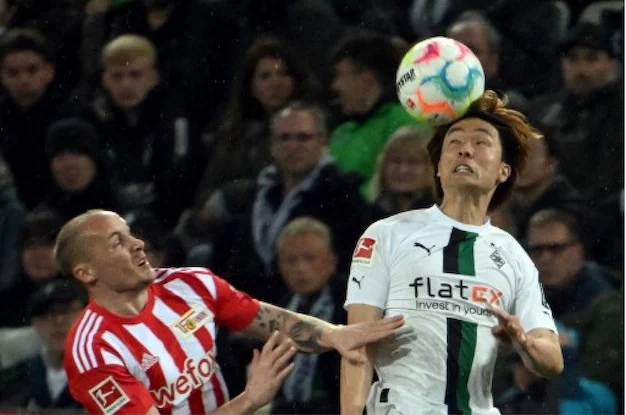AFP Sources Extra RÉFÉRENCE DOCUMENT043_DPA-PA_230423-99-422633_DPAI SLUGBORUSSIA MÖNCHENGLADBACH - 1. FC UNION BERLIN DATE DE CRÉATION23/04/2023 VILLE/PAYSMÖNCHENGLADBACH, ALLEMAGNE CRÉDITFEDERICO GAMBARINI / DPA / DPA PICTURE-ALLIANCE VIA AFP POIDS FICHIER/PIXELS/DPI12,45 Mb / 2555 x 1703 / 300 dpi INSTRUCTIONS SPÉCIALES GERMANY OUT Borussia Mönchengladbach-1. FC Union Berlin 23 April 2023, North Rhine-Westphalia, Mönchengladbach: Soccer: Bundesliga, Borussia Mönchengladbach - 1. FC Union Berlin, Matchday 29, Stadium im Borussia-Park. Gladbach's Ko Itakura (r) and Sven Michel of Union Berlin fight for the ball. Photo: Federico Gambarini/dpa via Afp