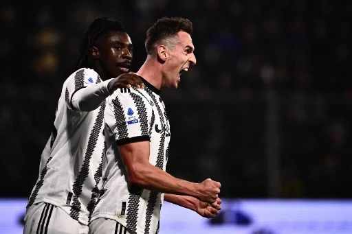 Juventus' Polish forward Arkadiusz Milik celebrates with Juventus' Italian forward Moise Kean (L) after opening the scoring during the Italian Serie A football match between Cremonese and Juventus on January 4, 2023 at the Giovanni-Zini stadium in Cremona. (Photo by Marco BERTORELLO / AFP)