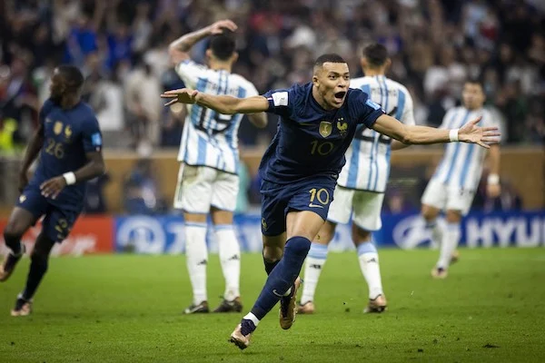 Doha (Qatar) 18/12/2022 - finale Mondiali di calcio Qatar 2022 / Argentina-Francia / foto Imago/Image Sport nella foto: esultanza gol Kylian Mbappe’ ONLY ITALY
