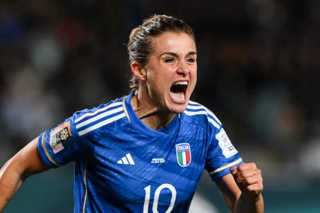 Italy's forward #10 Cristiana Girelli celebrates scoring her team's first goal during the Australia and New Zealand 2023 Women's World Cup Group G football match between Italy and Argentina at Eden Park in Auckland on July 24, 2023. Saeed KHAN / AFP
