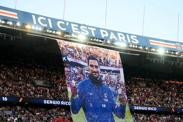 A huge portrait of Paris Saint-Germain's Spanish goalkeeper Sergio Rico, who is in serious condition after a horse-riding accident, is seen during the French L1 football match between Paris Saint-Germain (PSG) and Clermont Foot 63 at the Parc des Princes Stadium in Paris on June 3, 2023. (Photo by FRANCK FIFE / AFP)