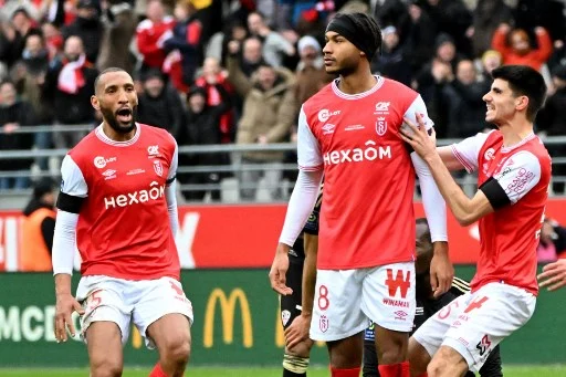 Reims' Swedish midfielder Jens Cajuste (C) is congratulated by team mates after scoring a goal during the French L1 football match between Reims and Ajaccio at the Auguste-Delaune stadium in Reims on March 5, 2023. (Photo by FRANCOIS LO PRESTI / AFP)