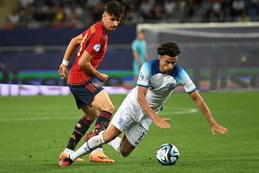 Spain's Gabriel Veiga and England's Curtis Jones vie for the ball during the UEFA European Under-21 Championship final football match between England vs Spain at Batumi Arena in Batumi on July 8, 2023. (Photo by Vano SHLAMOV / AFP)