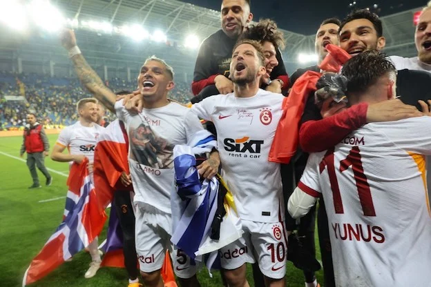 Galatasaray's Belgian forward Dries Mertens (C) and Uruguayan midfielder Lucas Torreira (L) celebrate with teammates after winning the team's 23rd title following Turkey's Super Lig football match between MKE Ankaragucu and Galatasaray at Eryaman Stadium in Ankara, on May 30, 2023. (Photo by Adem ALTAN / AFP)