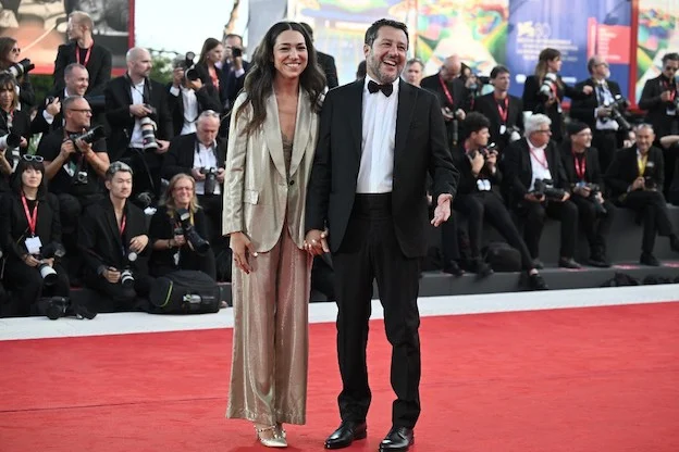Francesca Verdini and partner Italy's Deputy Prime Minister and Minister of Infrastructure, Matteo Salvini pose on the red carpet before the opening ceremony of the 80th International Venice Film Festival, on August 30, 2023, at Venice Lido. (Photo by Tiziana FABI / AFP)