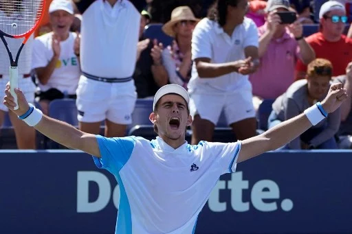 Italy's Matteo Arnaldi reacts after the match point against Britain's Cameron Norrie their US Open tennis tournament men's singles third round match at the USTA Billie Jean King National Tennis Center in New York City, on September 2, 2023. (Photo by TIMOTHY A. CLARY / AFP)