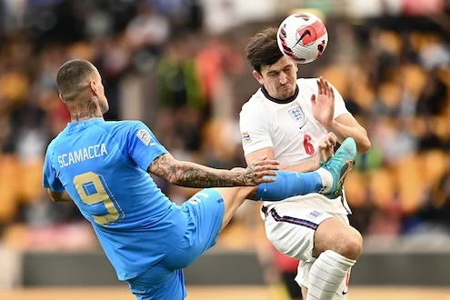Mg Wolverhampton (Inghilterra) 11/06/2022 - Uefa Nations League / Inghilterra-Italia / foto Matteo Gribaudi/Image Sport nella foto: Gianluca Scamacca-Harry Meguire