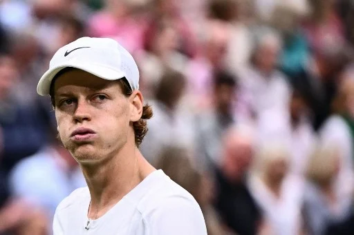 Italy's Jannik Sinner reacts as he plays against Serbia's Novak Djokovic during their men's singles semi-finals tennis match on the twelfth day of the 2023 Wimbledon Championships at The All England Lawn Tennis Club in Wimbledon, southwest London, on July 14, 2023. (Photo by SEBASTIEN BOZON / AFP) / RESTRICTED TO EDITORIAL USE