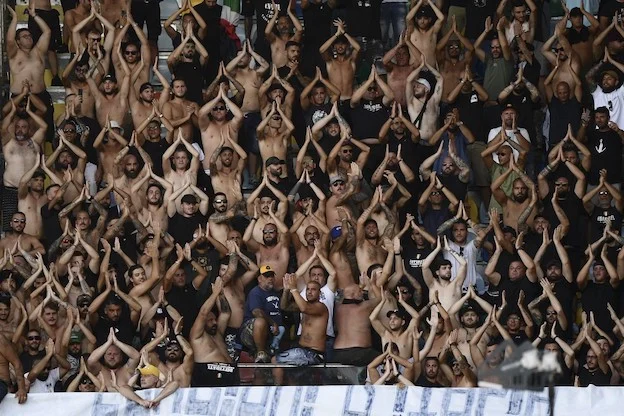 Napoli's supporters cheer before the Italian Serie A football match Frosinone vs Napoli at the Benito Stirpe stadium in Frosinone, on August 19, 2023. (Photo by Filippo MONTEFORTE / AFP)