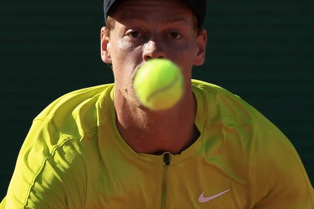 Italy's Jannik Sinner eyes the ball as he plays against Italy's Lorenzo Musetti during the Monte-Carlo ATP Masters Series tournament quarter final tennis match in Monte Carlo on April 14, 2023. (Photo by Valery HACHE / AFP)