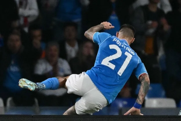 Napoli's Italian forward #21 Matteo Politano celebrates after scoring the team's first goal during the UEFA Champions League 1st round day 4 Group C football match Napoli vs Union Berlin at the Diego Armando Maradona stadium in Naples on November 8, 2023. (Photo by Alberto PIZZOLI / AFP)
