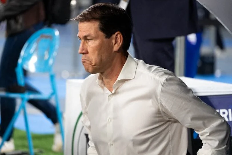 Napoli's French coach Rudi Garcia looks on during the Italian Serie A football match between Napoli and Fiorentina at the Diego Armando Maradona stadium in Naples on October 8, 2023. Eliano Imperato / Controluce via AFP