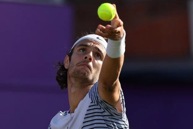 Italy's Lorenzo Musetti serves to Britain's Jan Choinski during their men's single tennis match on Day 3 of the Cinch ATP tennis Championships at Queen's Club in west London, on June 19, 2023. (Photo by Adrian DENNIS / AFP)