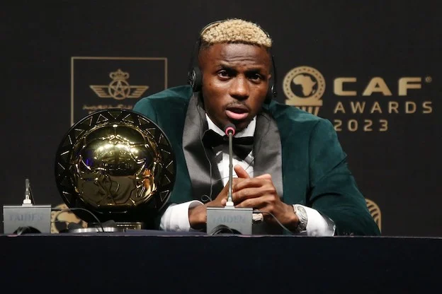 Victor Osimhen of Nigeria receives the Men's Player of the Year award during the 2023 Confederation of African Football (CAF) Awards in Marrakesh on December 11, 2023. (Photo by AFP)