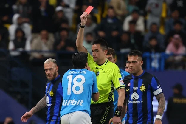 Italian referee Antonio Rapuano gives a red card for Napoli's Argentine forward #18 Giovanni Simeone during the Italian Super Cup final football match between Napoli and Inter Milan at Al-Awwal Park Stadium in Riyadh, on January 22, 2024. (Photo by Fayez NURELDINE / AFP)