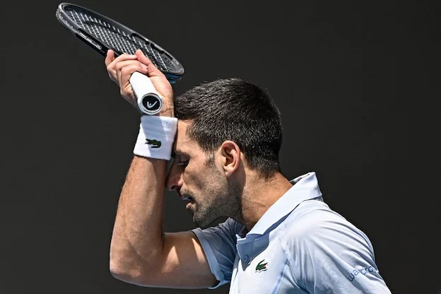 Serbia's Novak Djokovic reacts while playing against Italy's Jannik Sinner during their men's singles semi-final match on day 13 of the Australian Open tennis tournament in Melbourne on January 26, 2024. (Photo by Lillian SUWANRUMPHA / AFP) / -- IMAGE RESTRICTED TO EDITORIAL USE - STRICTLY NO COMMERCIAL USE --