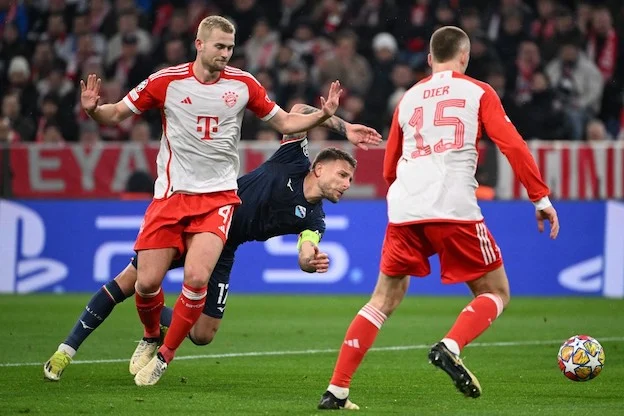 Lazio's Italian forward #17 Ciro Immobile (C) vies for the ball with Bayern Munich's Dutch defender #04 Matthijs de Ligt (L) and Bayern Munich's English defender #15 Eric Dier during the UEFA Champions League round of 16, second-leg football match between FC Bayern Munich and Lazio in Munich, southern Germany on March 5, 2024. (Photo by Kirill KUDRYAVTSEV / AFP)