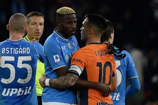 Napoli's Nigerian forward #09 Victor Osimhen greets Inter Milan's Argentine forward #10 Lautaro Martinez at the end of the Italian Serie A football match between Napoli and Inter Milan on December 03, 2023 at the Diego Armando Maradona stadium in Naples. (Photo by Filippo MONTEFORTE / AFP)